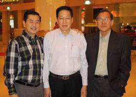 砂拉越河婆同乡会会长蔡展文(左)与\bt365官网总会长拿督黄汉良(中),以及秘书长黄源清相见欢。